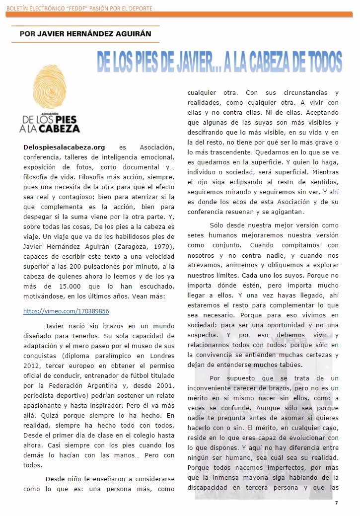 De los pies a la cabeza, su filosofía más acción, fue requerida por el presidente de la FEDDF (Federación Española de Deportistas con Discapacidad Física), José Alberto Álvarez, como cuidado artículo de dos páginas (7 y 8) en el noveno boletín ‘Pasión por el Deporte’ del citado organismo y correspondiente al mes de enero de 2017. La publicación también dedica una página (24) a hacerse eco del premio internacional de fotografía Fundación Grupo Norte “Las personas con discapacidad en la vida cotidiana” otorgado a uno de nuestros fundadores y alma máter, Alfonso Reyes Luna.